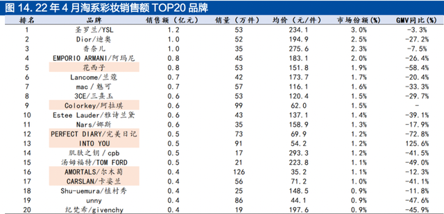 +淘宝)彩妆的销售额为42亿元,同比增速-35.1%。4月淘系彩妆的销量达0.7亿件,环比-22.9%;彩妆均价61.2元/件,同比增长