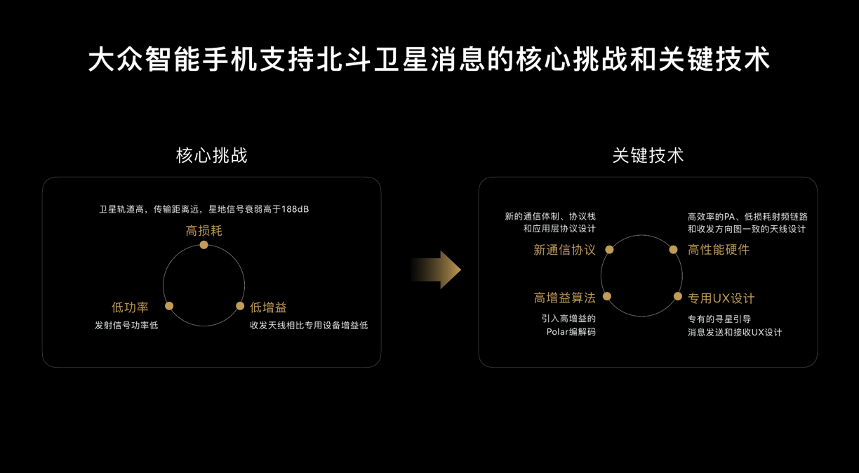 最终,华为通过建立新的手机终端与卫星之间的通信协议以及高性能的硬件设计,提高卫星通信的性能和效率,减少信号损耗;为了保证卫星通信服务的精确与可靠,降低卫星信号传输过程中的噪声与干扰,华为采用高增益算法,提升信号解码率,让信号聚焦,减少发散,从而能够直达卫星;通过专有的巡星引导UX设计,为用户带来可视化的使用方式,更加方便用户操作。让手机终端自动寻找卫星的位置,帮助用户建立更稳定的连接,进而更好地提升信息收发性能。