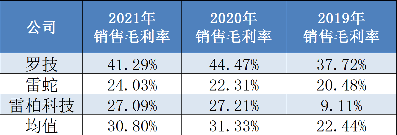 上述两张表格的数据显示,以智迪科技、朝阳科技(002981.SZ)、显盈科技(301067.SZ)、佳禾智能(300793.SZ)、传艺科技(002866.SZ)为代表的主营业务包含键盘、鼠标等产品或类似消费电子产品ODM 生产的公司,在2019年、2020年、2021年的销售毛利率行业均值分别为21.7%、20.83%、15.66%;相比之下,以罗技、雷蛇(01337.HK已退市)、雷柏科技(002577.SZ)为代表的拥有自主品牌的知名计算机外设厂商在2019年、2020年、2021年的销售毛利率行业均值分别为22.44%、31.33%、30.8%,比ODM业务模式的公司分别高0.74%、10.5%、15.14%。由此可见,以ODM为主要模式的公司销售毛利率整体低于拥有自主品牌的公司,且差距还在持续增大;增长趋势方面,前者近三年销售毛利率持续下降,降幅6.04%,后者三年来上涨8.36%。