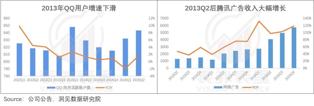原因在于,微信发展的同时,腾讯基于QQ系列生态(QQ空间、 QQ客户端、手机QQ等),上线广点通,广告投放从“曝光购买”升级到“效果购买”,刺激了QQ系的广告业务。