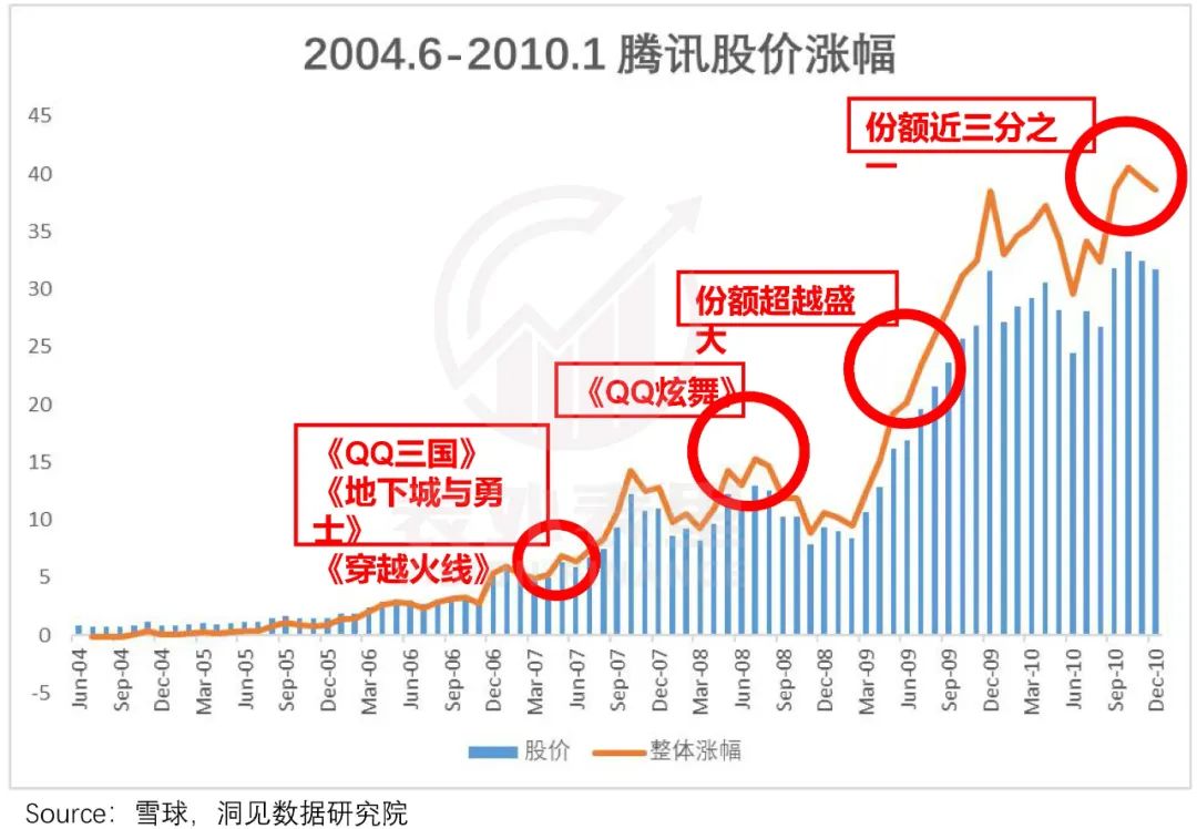重量级游戏上,《地下城与勇士》《穿越火线》等爆款,让腾讯从2009年开始,取代盛大成为国内市场份额最高的游戏公司,一定程度助力了股价起飞。