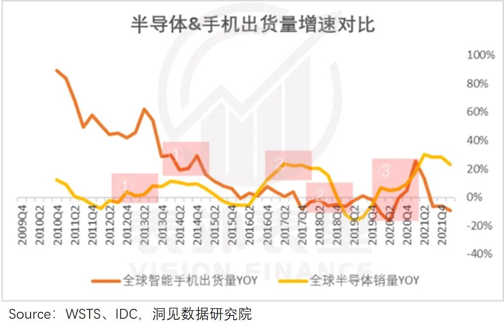 备注:半导体和智能手机出货量增长的波动也会受周期外其他因子的影响,此处大致做趋势**性对比。