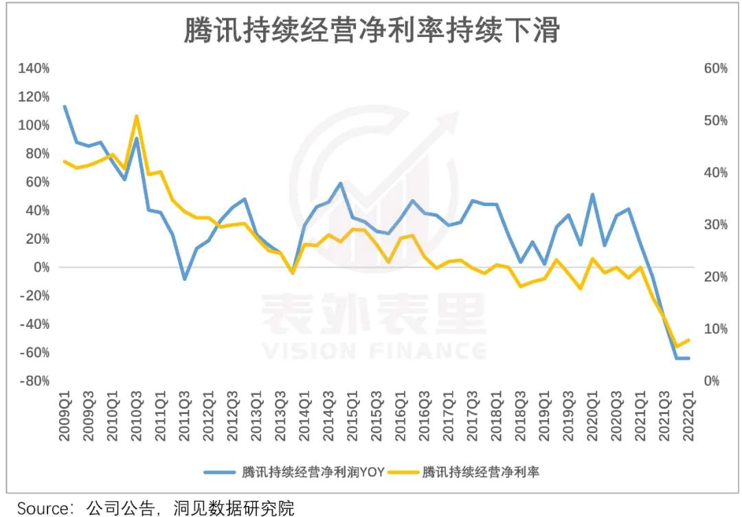 数据显示,过去数十年间,腾讯的持续经营净利润同比增速,以及持续经营净利率,均呈现明显的下滑态势。