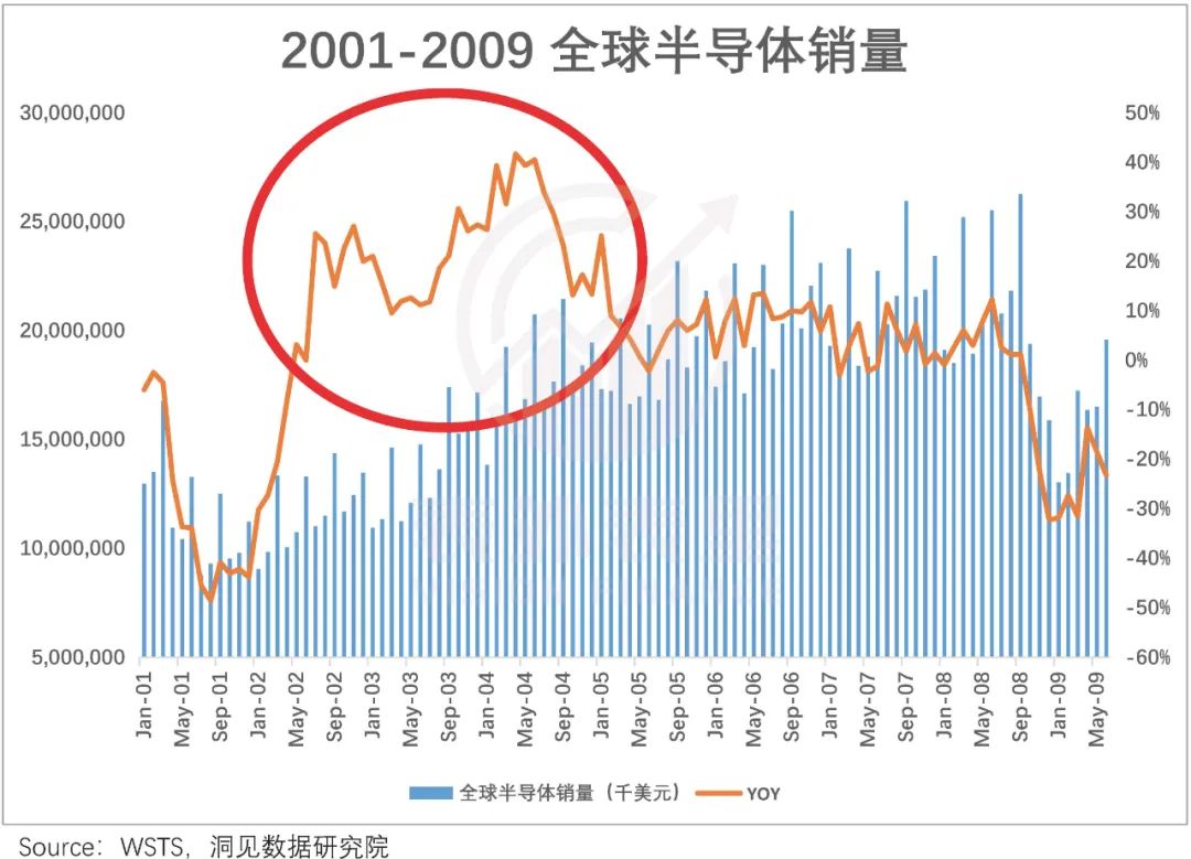可以看到,在PC硬件厂商需求大增下,半导体行业2002年-2004年,全球销量出现了高峰。