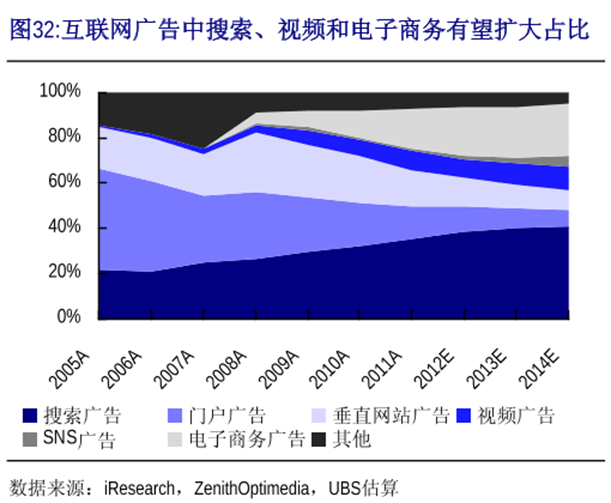 这种精准流量概念很快传到了国内。如下图,2005年之后,国内搜索广告份额一路上行,挤压着门户广告的份额。