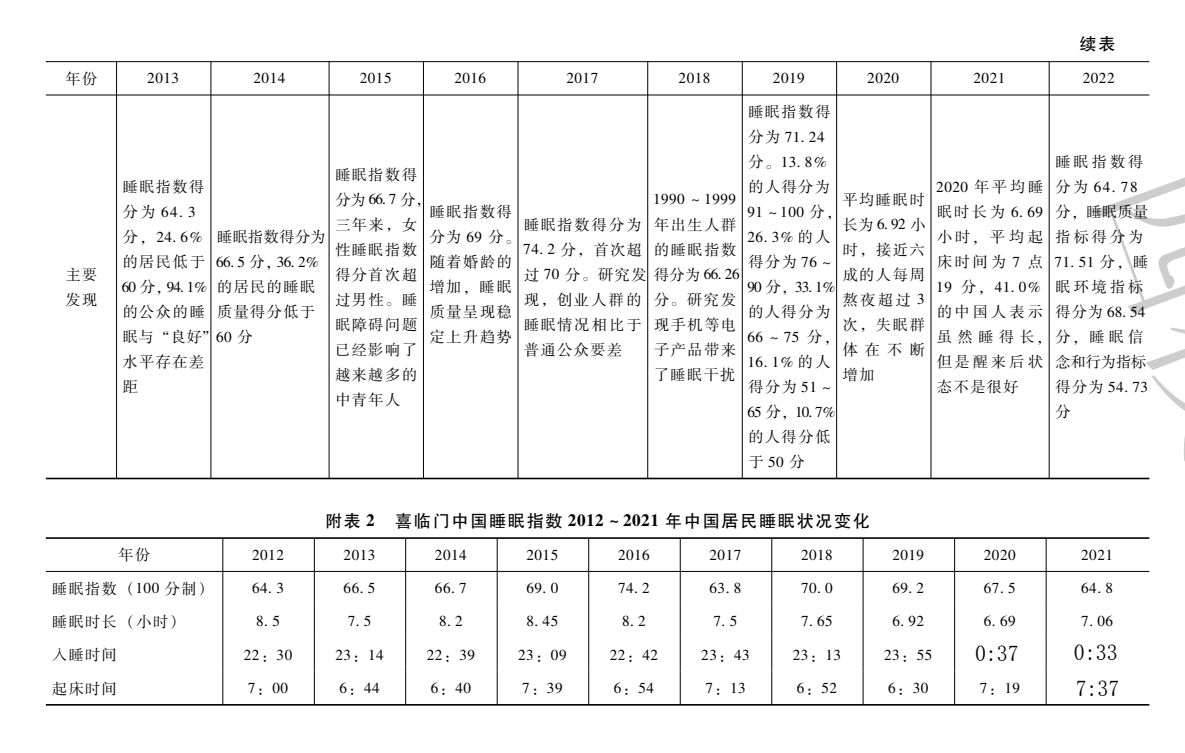 据喜临门睡眠研究院联合中国社科院发布的《中国睡眠研究报告2022》显示,2022年国人的睡眠指数得分为64.78分,略高于及格线;但在2012年至2021年的十年时间里,国人睡眠平均时长已从2012年的8.5小时缩减到2021年的7.06小时,睡觉时长减少近1.5小时。