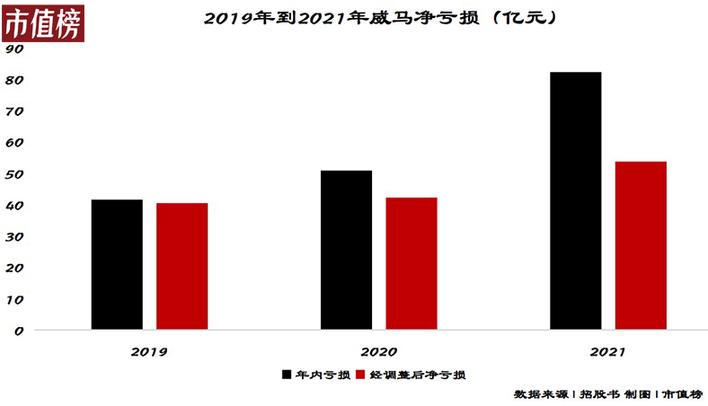 收入也水涨船高,2019年至2021年,威马的营收分别为17.62亿元、26.72亿元和47.43亿元。与收入一同上扬的,是威马的亏损额,三年累计归母净亏损174亿元,其中2021年亏损82亿,经调整亏损额为53.6亿元。