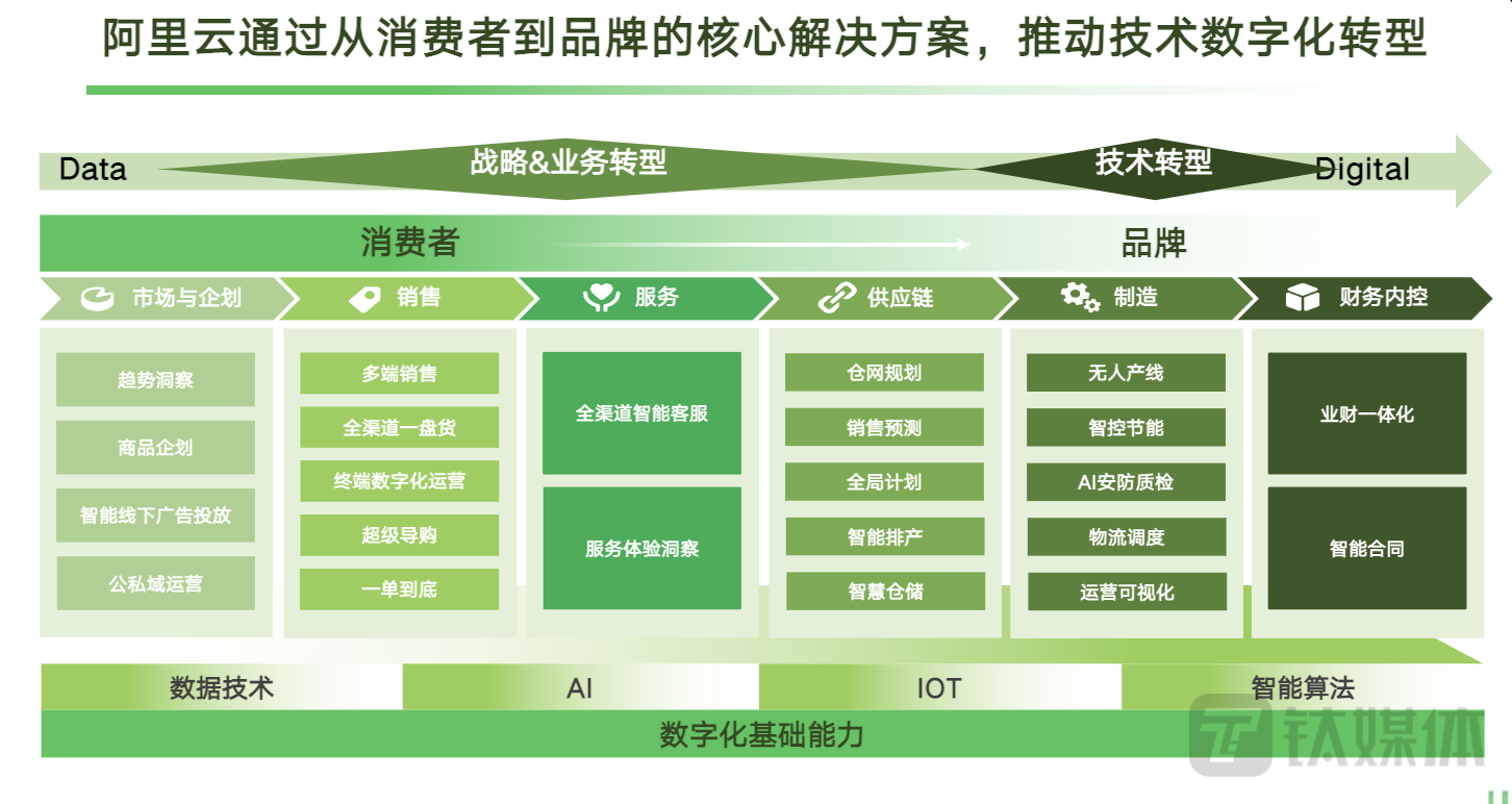 阿里通过消费者到品牌的核心解决方案有二十几款,从我个人的角度来说,阿里有两个能力特别突出,一个是因为支撑业务的高速增长而沉淀下来的云能力,这里面包括了计算能力、存储能力、网络能力、安全能力、AI、大数据等等,这是非常强的。云的本质说到底是对高频率资源的复用和资源调度的能力,这种场景更多存在于业务波动的时期;如果业务本身是稳态的,你对云的理解就不一定足够。正是因为阿里有这种波峰、波谷的变化,所以使得我们近十年来不断地拓展这方面的能力,从而沉淀出来很强的云底座技术。