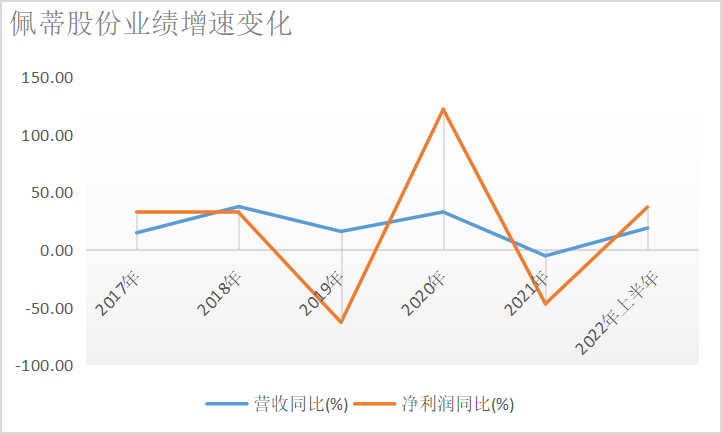 值得注意的是,佩蒂股份2022年第二季度的扣非后归母净利润为0.64亿元,从其历史业绩来看,达到了其上市以来的单季度最高值。显然,相较于2021年扣非后归母净利润的下滑,2022年上半年的佩蒂股份争了一口气。不过,这似乎也显示出了佩蒂股份存在的业绩波动问题。2017年至今,公司营收的同比增速分别为15%、38%、16%、33%、-5%、19%。