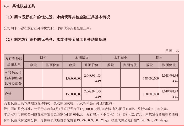 上图就是东方财富2021年中报的注释。公司在2021年4月发行了总额158亿的可转债,扣除发行费用之后,权益成分公允价值为20.49亿,负债公允价值为137.32亿。结果就是公司其他权益工具增加了20.49亿,非流动负债中的应付债券增加了138.30亿 (当期增加了应计利息和溢价摊销) 。