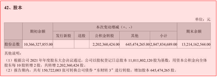 到2022年中报的时候,东方财富转债已经全部转换完毕,增加了股本6.45亿股,资本公积147.63亿。