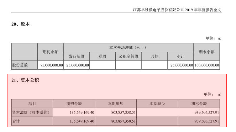 以2019年上市的卓胜微为例,这家公司当时发行了2500万股,发行价35.29元,募集资金的净额是8.29亿。对应的会计操作就是当年的实收资本 (或股本) 项目从0.75亿增加0.25亿 (每股面值1元,增加了2500万股) 到1亿,多出的计入资本公积—资本溢价,得到(8.29-0.25)=8.04亿。