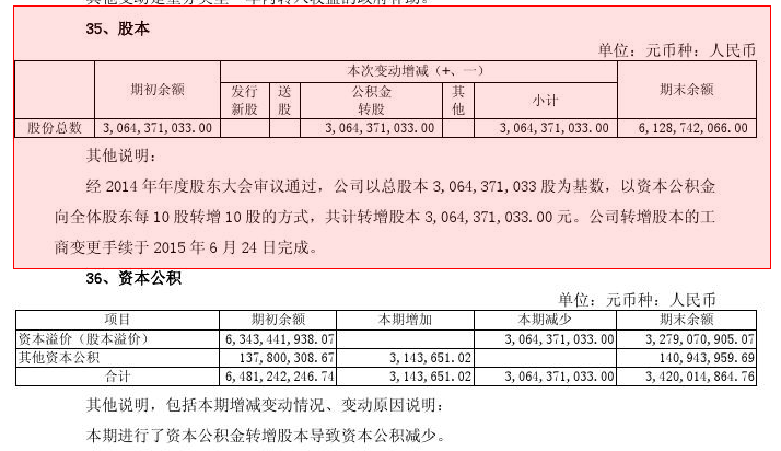 上图是伊利股份2015年10转增10的中报附注。伊利股份从资本公积-资本溢价 (股本溢价) 科目中划出了30.64亿,转到了股本项下,从而完成了这次10转10的会计操作,由此伊利股份的实收资本 (或股本) 也实现了翻倍。