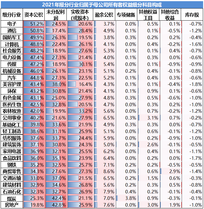 资本公积占比较低的行业,往往也意味着IPO时的估值不高,或者归属于母公司所有者权益中,公司生产经营的积累的影响更大。比如占比最低的房地产和煤炭,资本公积分别只占到归属于母公司所有者权益的19.8%和25.3%,而代表积累的未分配利润的占比分别为42.8%和42.4%。