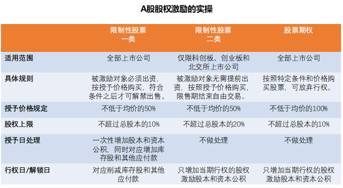股权激励是A股常见的对公司管理层的一种激励方式,A股的股权激励大体可以分为三类,一类和二类限制性股票、股权期权。这其中一类限制性股票目前主要是主板公司,条件相对二类要严苛,总体标准与股票期权处于一个水平上,而二类限制性股票仅限科创板、创业板和北交所上市公司,条件要松很多。