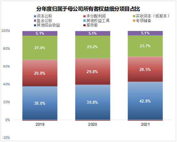总体看,资本公积占到归属于母公司所有者权益的40%左右,未分配利润不到30%,实收资本 (或股本) 通常占25%左右,盈余公积则比较稳定,一般在5%出头。