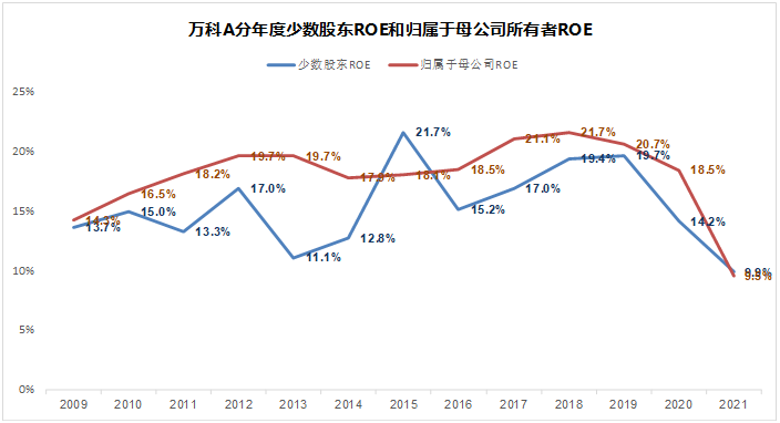 通过少数股东ROE和归属于母公司所有者ROE两个指标我们可以发现,从净资产收益率的角度看,2009年以来,大部分年份万科归属于母公司所有者的净资产收益率,是要高于少数股东的净资产收益率的。因此,我们很难说,万科通过这种方式向管理层或者相关利益方进行了利益输送。