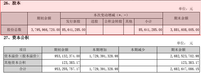 上图是五粮液2018年中报定增发行的结果。该次定增共发行8564万股,价格21.64元,扣除发行费用之后的资金,在扣除新增股本之后,直接充实到资本公积项目。可以发现五粮液本期资本溢价 (股本溢价) 科目下,本期增加了17.29亿。