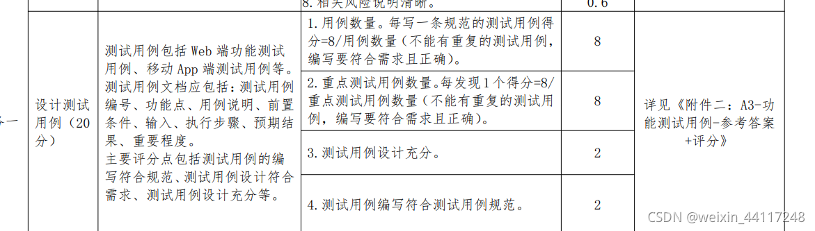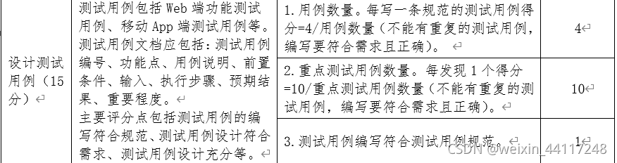 参考:测试用例从百度中能找到的就这样(根据评分标准中大概连4分都比较难。。。) 这也是比赛中拉开差距的地方(我也看了一些主办方学校写的测试用例也不咋地,甚至是21年国二写的都.....)咳咳提醒一下吧人家明明是功能测试 写着写着就变成了 安全测试用例等等 根据裁判长的话就是说无效的测试用例设计太多 比如说参考答案只有一条 ,页面UI、颜色啥啥的写3.4条5.6条这浪费自己比赛的时间,也会被扣分吧