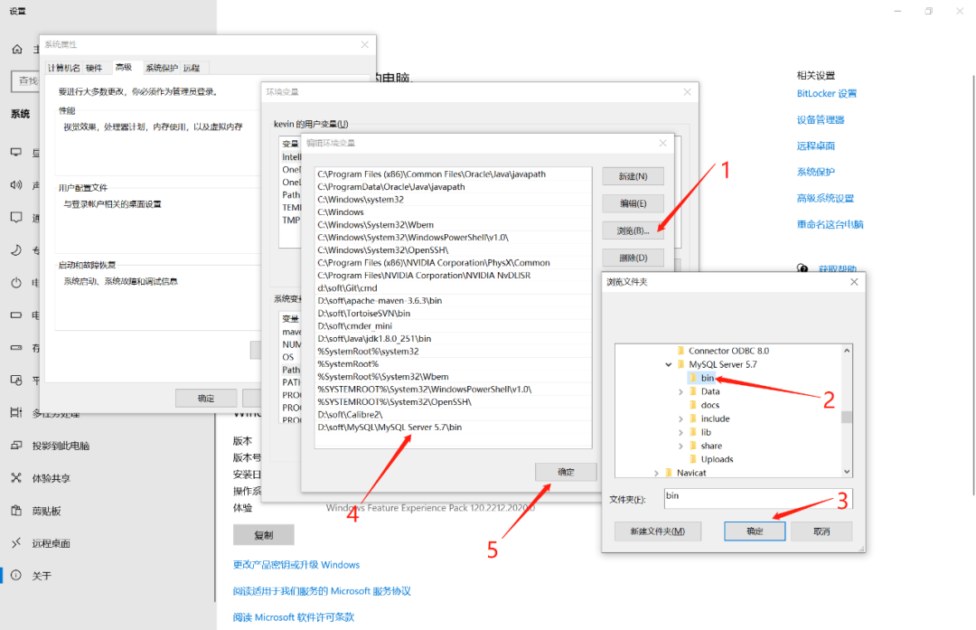 点击【浏览】按钮,选择MySQL安装目录下的bin目录,点击确定即可,然后依次点击【确定】关闭所有弹框,如下图所示。