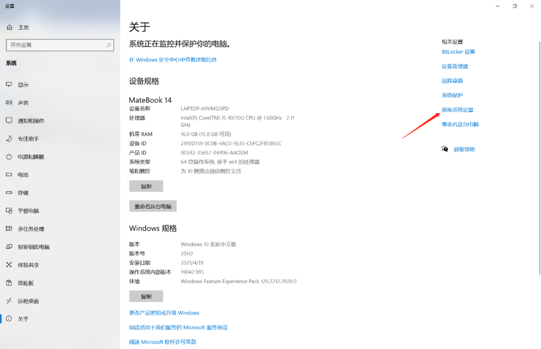 在【我的电脑】(或【此电脑】)图标上点击鼠标右键,点击【属性】。在打开页面的右侧有【相关属性】区域,可以找到【高级系统设置】(如下图所示)。