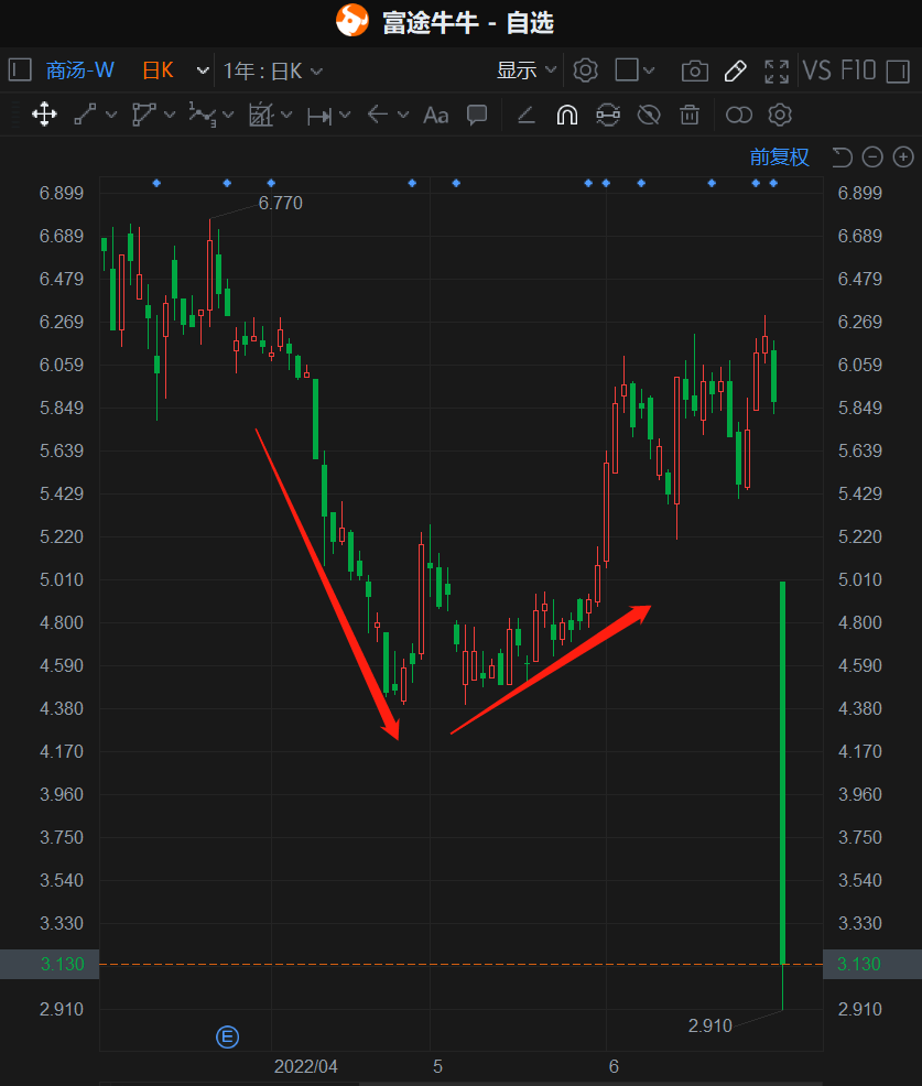 翻看商汤科技在6月30日之前的行情可以发现,其股价在5月下旬曾跌至谷底,最近几个星期则稍有回升,正处于反弹趋势线上。如果资本想套现,现在就是合适的时机。