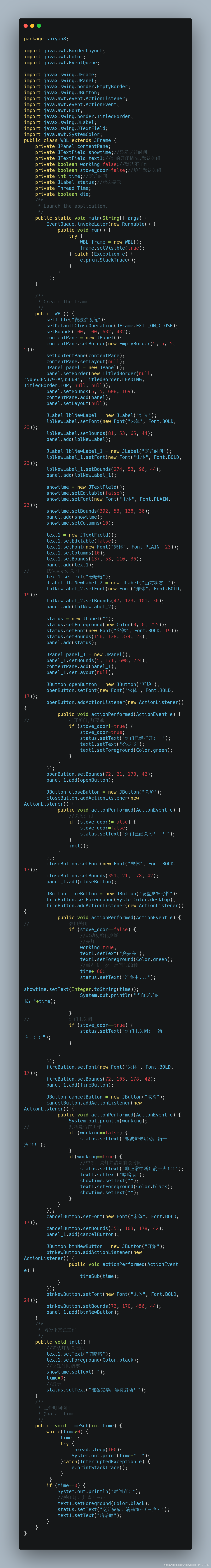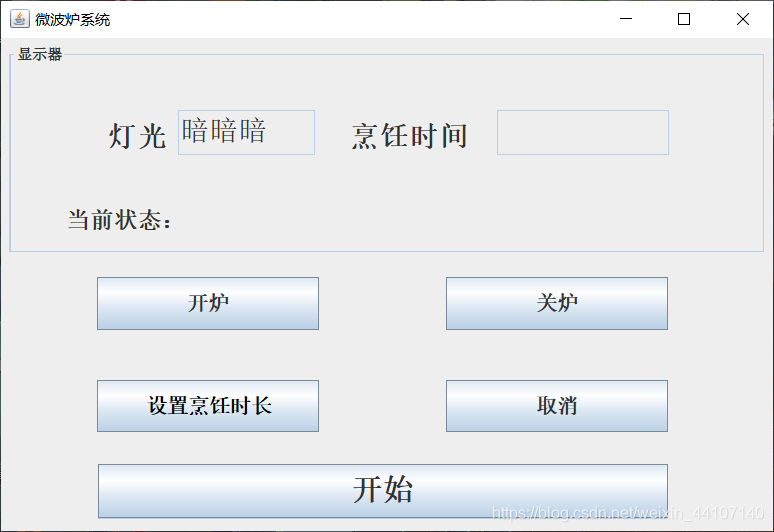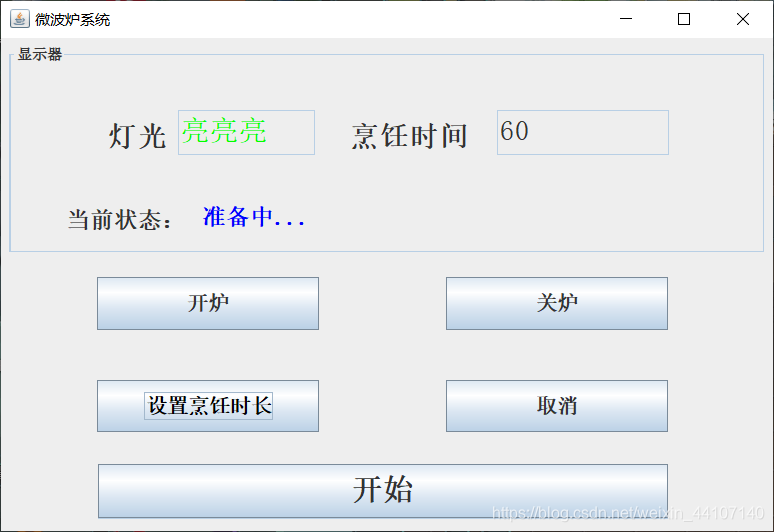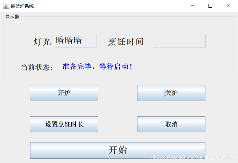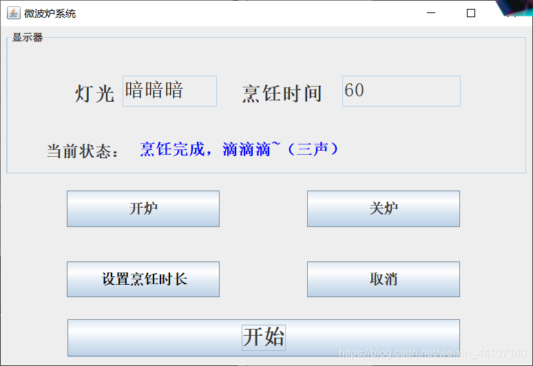 存在问题:在烹饪过程中点击“取消”按钮不能终止烹饪,本来考虑加上线程进去,但是尝试了没有搞好,还有那个鸣叫声,我只是用文字表示了一下