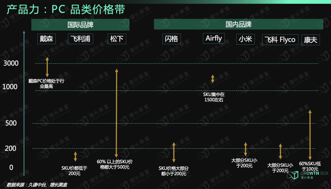 与高技术含量相对应的是高定价。相较于一众国产吹风机品牌,戴森切中了PC品类3000元以上的价格带,打开了高端空白市场。