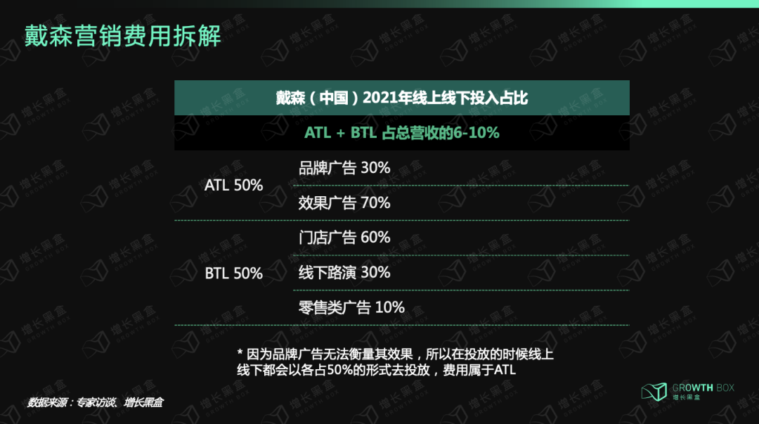 具体来看,戴森每年营销费用(包含促销)占整体营收的20%以上。其中,ATL(线上广告)和BTL(线下广告)纯广告投放占营收的6-10%。
