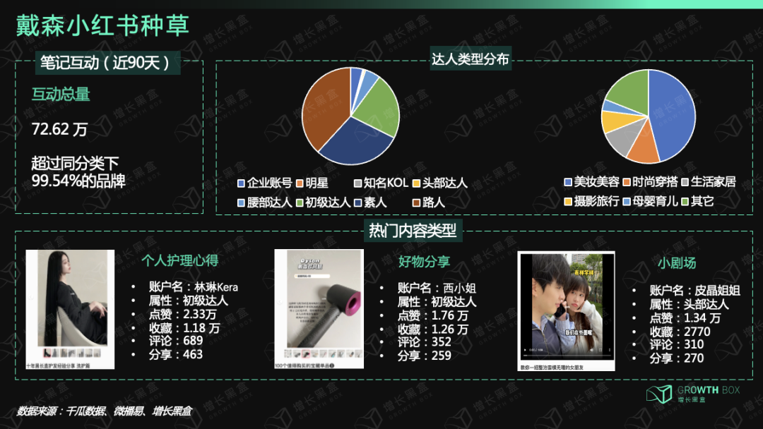 首先,在达人账号类型的选择上,戴森在社媒投放的账号类型以美妆和时尚穿搭账号为主。快消的逻辑再次得到印证。