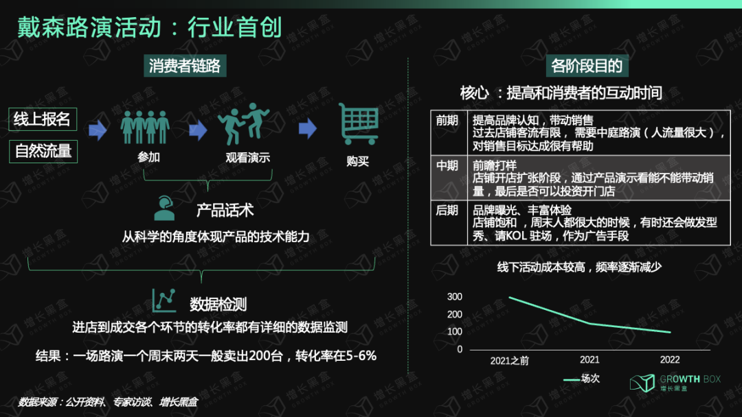 戴森对线下路演的价值定位,分为前中期三个阶段,不同阶段该策略被赋予了不同使命,具体可参考上图。