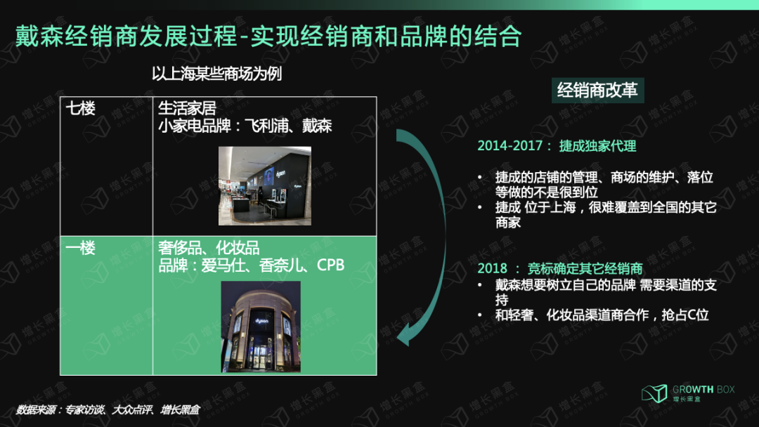 当然每位操盘手几乎都知道品牌落位商场核心位置的重要性,只是苦于没有资源,没有谈判砝码。那么,戴森是如何成功“降位”的呢?增长黑盒研究发现,这与戴森的经销商体系变革密切相关。