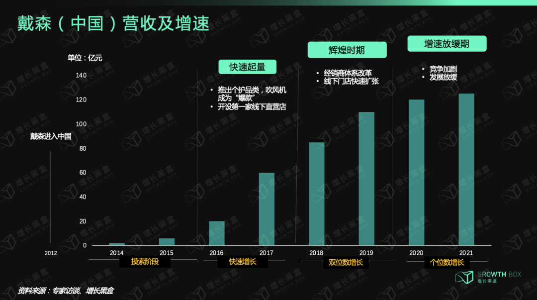 四年后,也就是在2012年,戴森正式第二次进入中国市场,并在2014年全国大范围开设门店,同时布局电商市场,这个时候营收才初见规模。