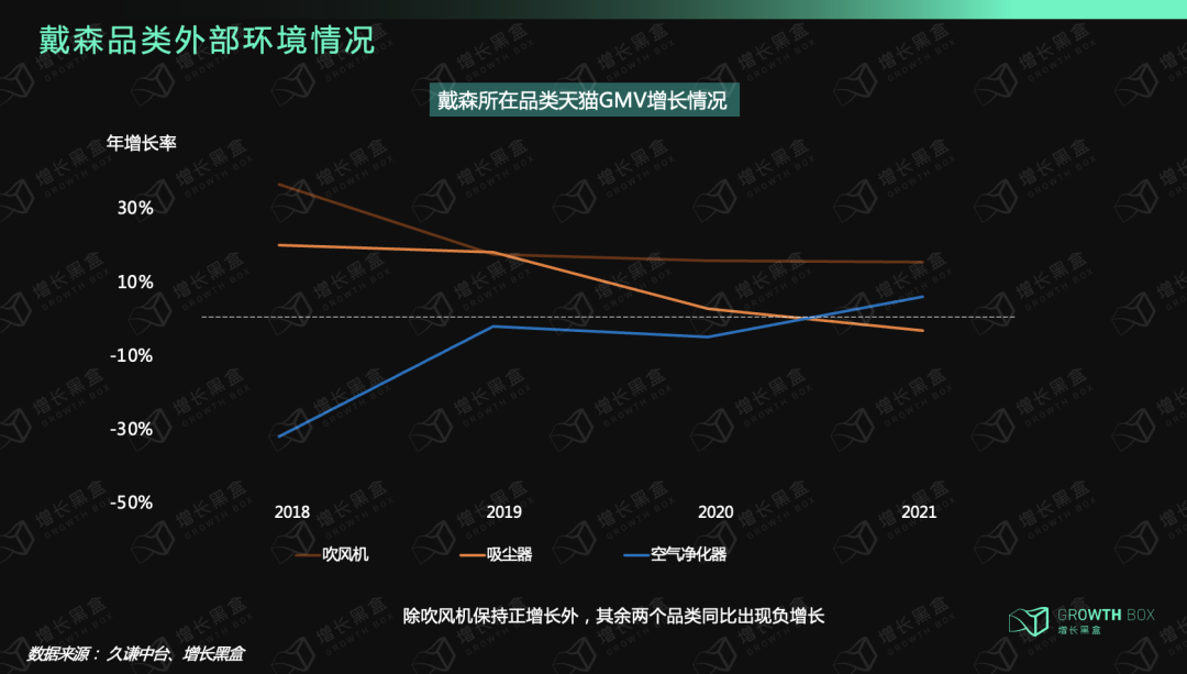 想要理解这一点,我们需要从戴森内部品类发展情况和外部大盘趋势两大方面来解构戴森的增长结构。
