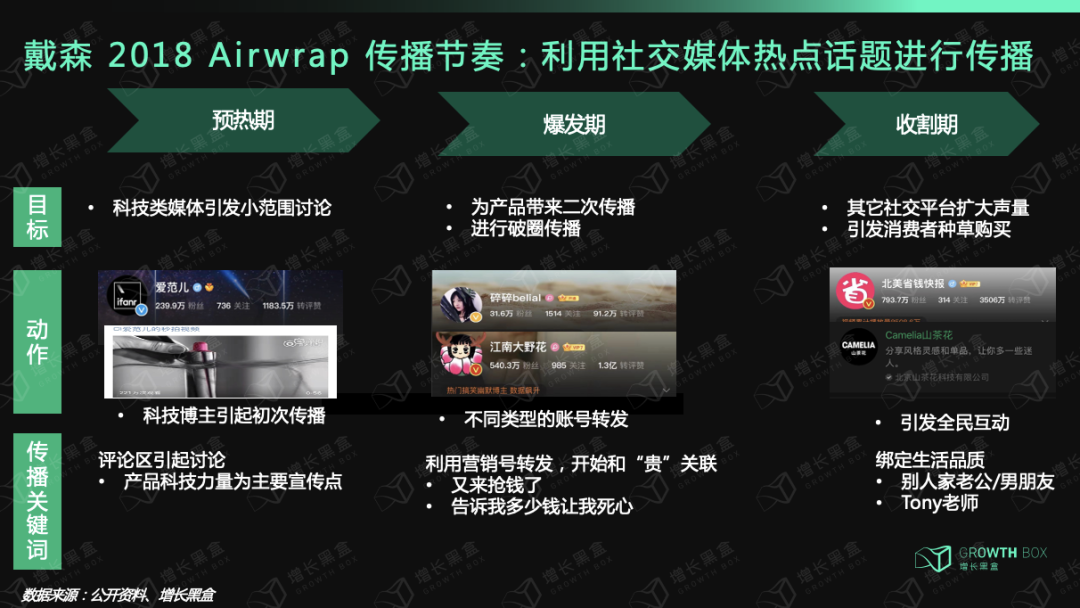 戴森在前期推广的时候非常讲究人群聚焦和品类聚焦,之前在打爆吸尘器和吹风机/卷发类产品的时候,都是先影响垂直人群,比如先找科技类KOL,再找美妆类KOL,逐渐圈层渗透。