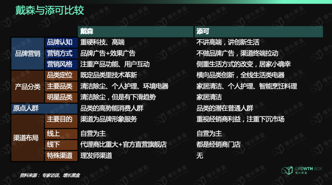 为此,本文后半部分我们将戴森与新锐品牌添可进行简单对比,并围绕以下三个维度着重探讨强势品牌与弱势品牌之间的博弈问题: