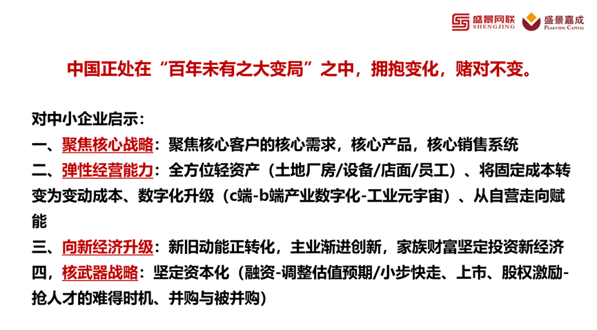 总结起来,在这样一个百年未有之大变局之下,我们要拥抱变化、赌对不变。对中小企业有四个战略启示,一是聚焦核心战略,二是弹性经营能力,三是向新经济转型升级,四是核武器战略——坚定资本化。