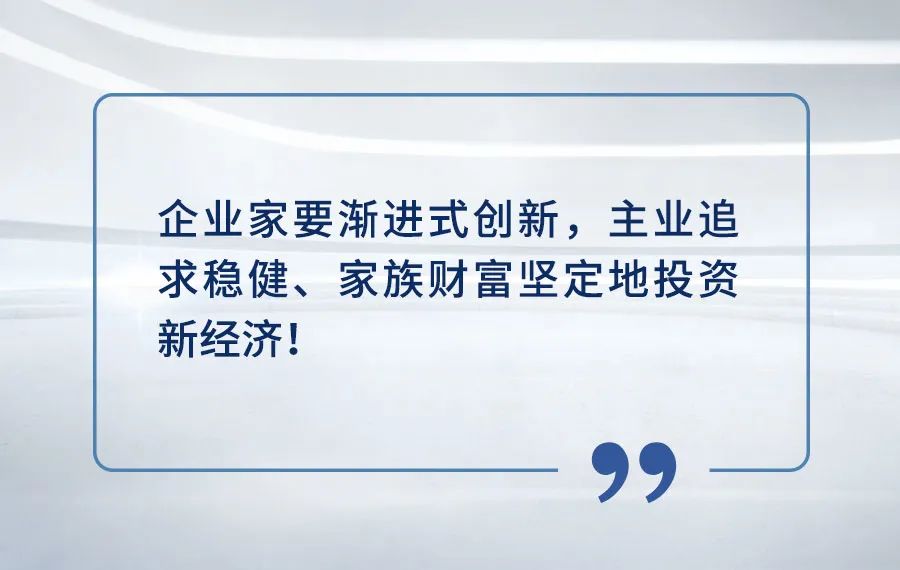 对每个企业来讲,就是要思考企业转型升级的方向在哪里,核心方向就是向新经济转型。主业转型务必要渐进式创新,稳住企业基本盘,家族财富投资新经济,则需要坚定不移。