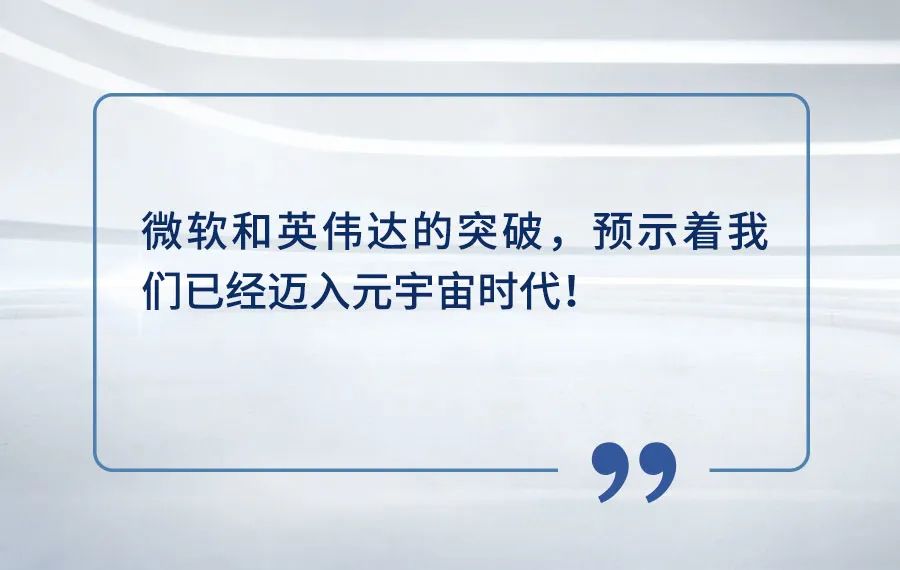 近期微软CEO发布了微软的工业元宇宙解决方案,我建议大家高度关注,这是一个标志性的事件。元宇宙就是下一代信息技术平台,我们当年从PC互联网到移动互联网,相当多企业错过了那一拨浪潮,现在正在迈向下一代信息平台就是“元宇宙”。伴随着微软在工业元宇宙领域解决方案的正式发布,甚至美国军方给了微软数百亿美金的元宇宙订单,元宇宙不再是一个概念,而是正在变成现实。