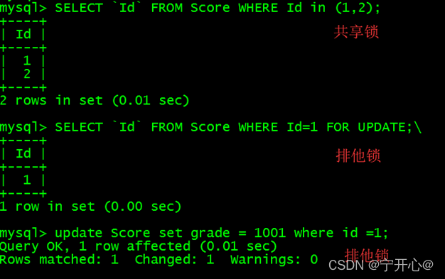加共享锁可以使用select ... lock in share mode语句。所以加过排他锁的数据行在其他事务种是不能修改数据的,也不能通过for update和lock in share mode锁的方式查询数据,但可以直接通过select ...from...查询数据,因为普通查询没有任何锁机制。