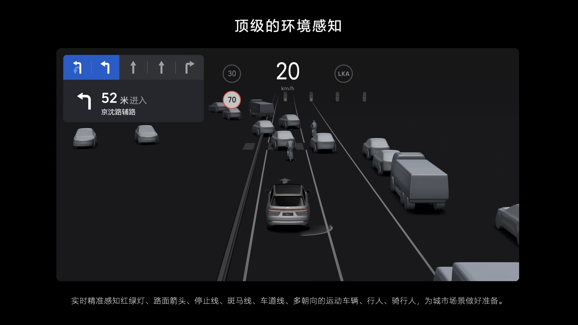 在理想的这套智能辅助驾驶解决方案中,硬件的环境感知能力能够实时精准地感知红绿灯、路面箭头、停止线、斑马线、车道线、多朝向的运动车辆、行人、自行车等交通参与者,为今后的城市场景做了更多的准备。