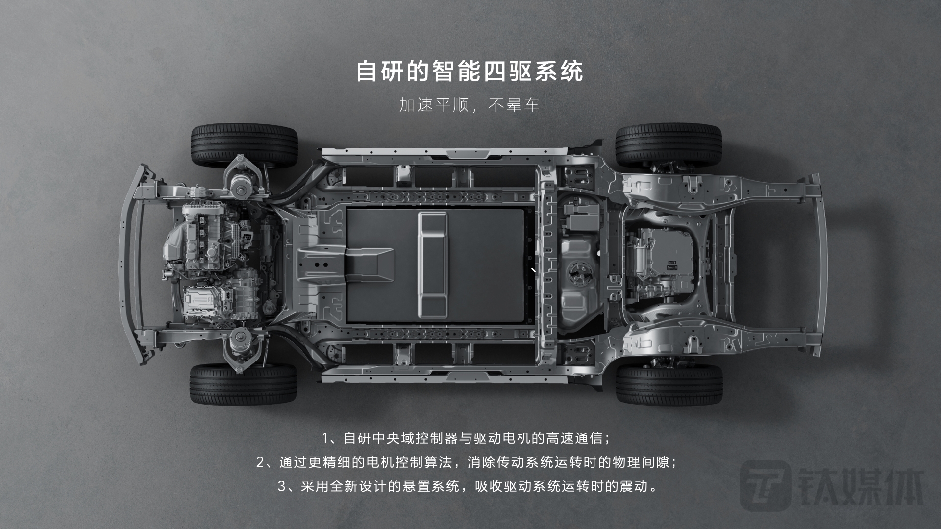 在底层安全控制策略上,这套四驱系统能通过IMU整车姿态传感器实现对整车姿态的感知,通过双电机实现前后轴扭矩的智能分配,通过ESP系统对地面附着力的感知,实时调整车轮之间的动力分配。