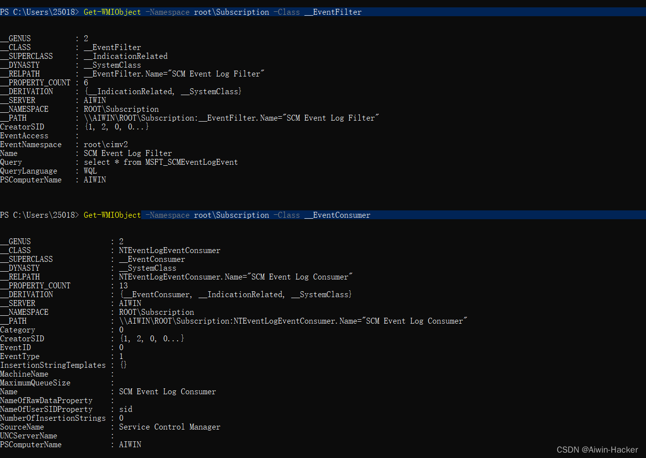 WMI提供强大的事件处理系统,当某进程被创建,通过WMI事件订阅来执行预先设置的脚本,其中触发事件具体条件包括事件过滤器,响应为事件消费者,两者要绑定在一起,所有的事件过滤器都被存储在EventFi莱特让对象实例中,事件消费者基于EventConsumer系统类派生的类。