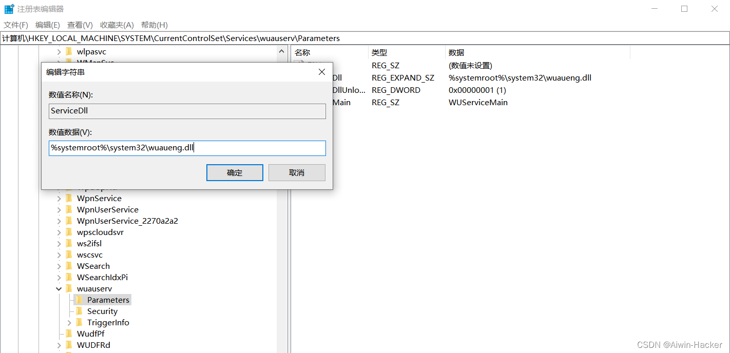 Parameters子项中的ServiceDll键值表明该服务由哪一个DLL文件负责,svchost启动会加载wuaueng.dll文件