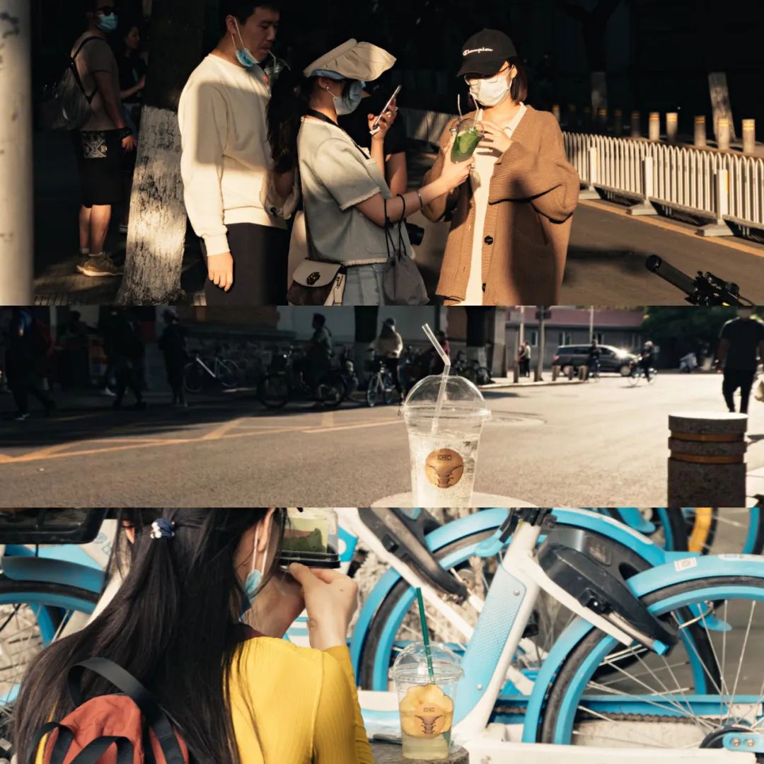 摊位所在胡同,周边有不少老式居民楼,经常会有骑着自行车的路人经过这个摊儿前。于是,近期总能在这里看这样一个充满违和感的场景:路旁的红砖绿荫下,有人拿着一杯一次性的塑料杯装着的鸡尾酒,边喝边聊着天,旁边停着几辆共享单车。