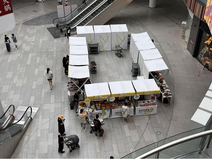 五一暂停堂食之后,楼上的餐饮商户们,在商场的组织下,在商场一层人流量最聚集的区域摆起了摊儿。