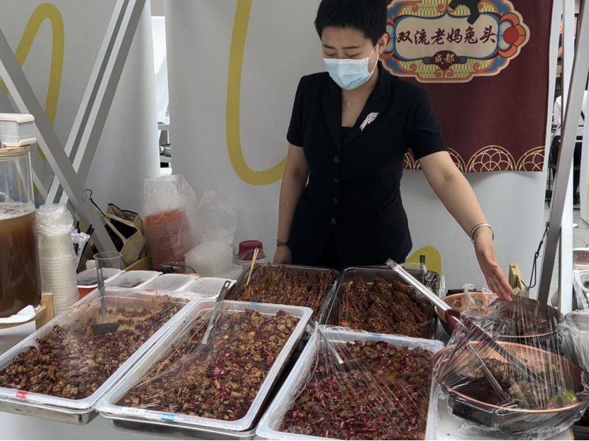 最热闹的是一家卖兔头的摊儿。摊儿前的店员还穿着门店里正式的深色套装,像是门店经理。“看一下冷吃兔、花椒鸡、花椒鸡胗、红油鸡爪、鸭头,还有清热解暑酸梅汤。”她对每一个经过的人介绍着。干脆利落的声音,也吸引了不少路过的人。