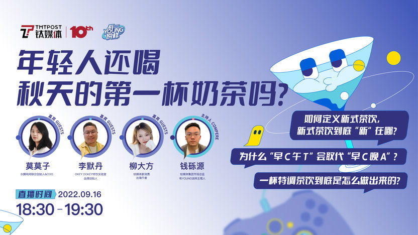 钛媒体直播沙龙《有YOUNG说样》第二期节目:年轻人还喝秋天的第一杯奶茶吗?邀请到水獭吨吨联合创始人&COO莫莫子,OKEY DOKEY特饮实验室品牌创始人李默丹(Jerry),钛媒体新消费、出海作者柳大方三位嘉宾,多角度分析年轻人喝水背后的故事。