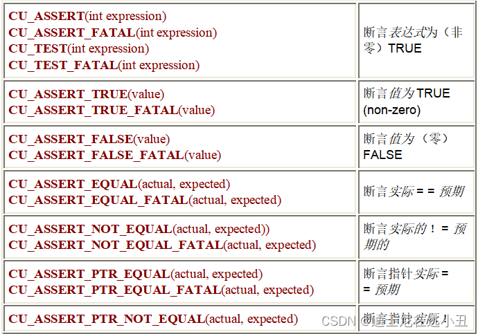 在写单元测试之前首先要知道关于单元测试专用的一些断言。如下图,一般来说用CU_ASSERT_EQUAL一个基本就可以全部解决。