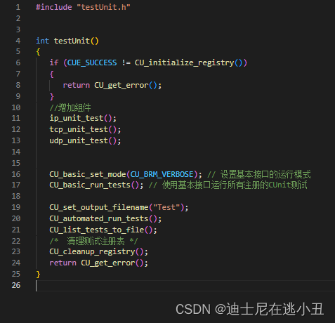 testUnit.c的内容如图,可以直接照用,唯一需要修改的是 增加组件 部分,这里是根据代码的文件来定的,例如:我的.c文件中有ip,tcp,udp等文件,则需要在每个.c文件中加上测试代码,然后将这个.c中的测试代码在此处(增加组件)调用(函数名自定)。